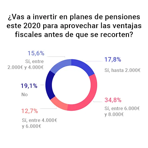 Según nuestra encuesta, un 34,8% de los inversores destinará entre 6.000 y 8.000 euros a sus planes de pensiones este 2020, mientras que un 12,7% invertirá entre 4.000 y 6.000 y un 15,6% entre 2.000 y 4.000.