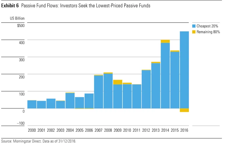 Pero yendo un paso más allá en el análisis de datos, lo cierto es que, incluso dentro de la gestión pasiva, los flujos de dinero de los inversores han buscado los productos más baratos. En este gráfico se puede ver cómo el mayor volumen de entrada se produce en los fondos con un coste más bajo (tomando como referencia el 20% de productos más baratos de la industria).