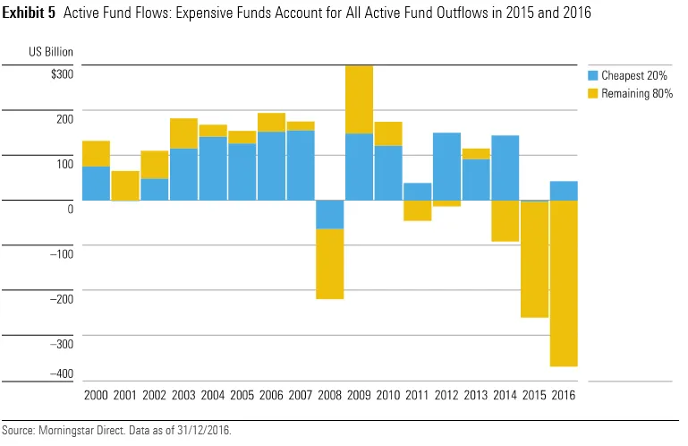 Lo mismo sucede con los fondos de gestión activa. Los inversores no están discriminando especialmente entre gestión pasiva o activa, sino que dentro de éste último bloque, muestran preferencia por las comisiones bajas. Excepto en 2008 y 2015, en los fondos más baratos de gestión activa ha entrado dinero sistemáticamente, año tras año. Por el contrario, los fondos caros están sufriendo reembolsos desde 2014 (en 2016, en concreto 369.000 millones de dólares, según datos de Morningstar).