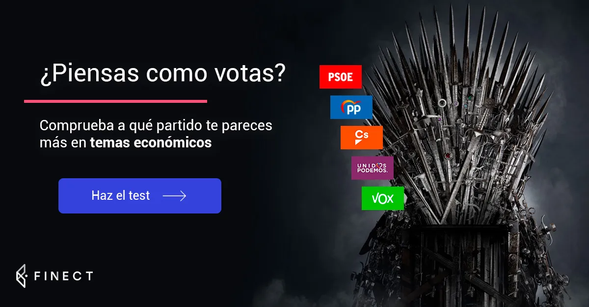 Si todavía os quedan dudas, en Finect hemos desarrollado una nueva herramienta con la que podréis comprobar con qué partido os identificáis más en función de lo que prometen en sus programas. Todo, para que acudáis a las urnas con las ideas claras y podáis elegir al candidato que se llevará "el trono de hierro" estas elecciones.