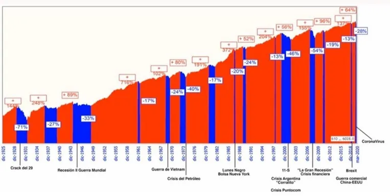 - Los movimientos de mercados, las crisis, las recesiones, representan a la evolución humana misma que no es una línea recta, pero con el tiempo el crecimiento acaba siendo positivo.