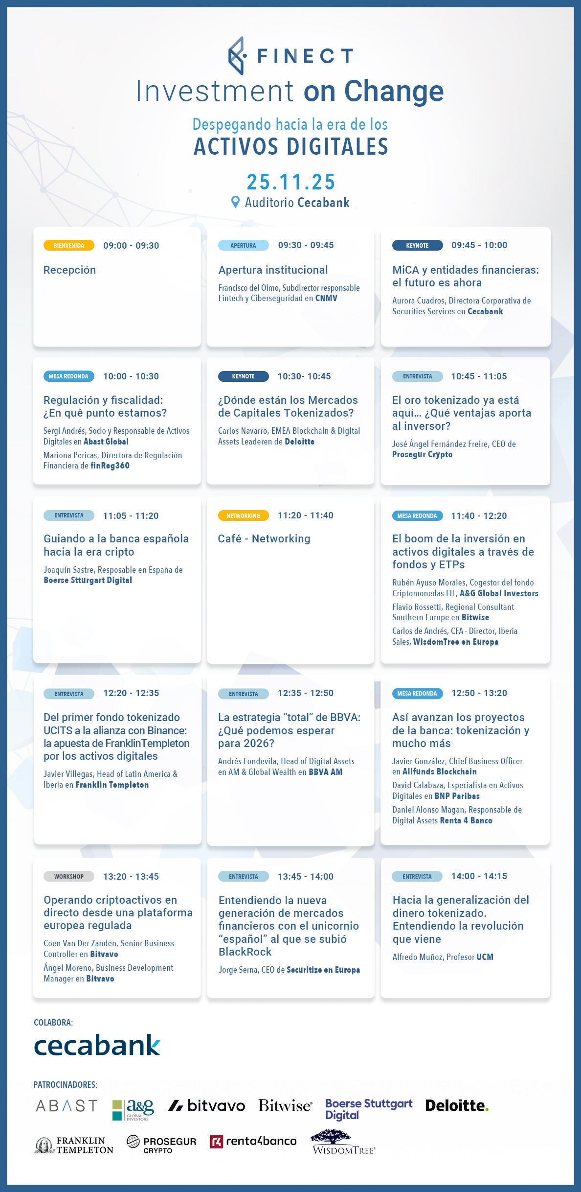 ¡Ya falta muy poco! Iniciamos la cuenta atrás para Finect Investment on Change 2025 (FIOC 2025), el evento sobre activos digitales de referencia para la industria de la inversión. El próximo martes 25 de noviembre, el Auditorio Cecabank, en Madrid, acogerá este encuentro exclusivo para analizar cómo se está redefiniendo el panorama financiero.