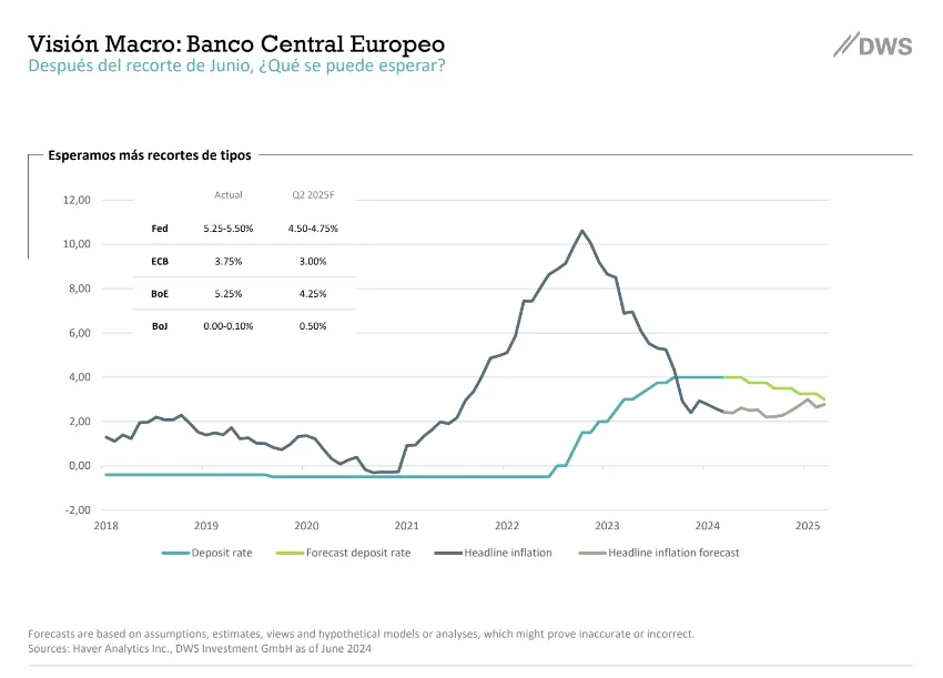 De este modo, tras los tres recortes de 25 puntos básicos cada uno, según DWS, para junio de 2025, el BCE dejaría los tipos en el 3% mientras que la Fed los dejaría en la horquilla del 4,5-4,75%.