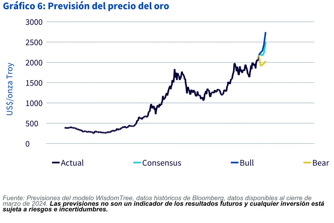 Sin embargo, desde WisdomTree también plantean otros escenarios como son el Bull y el Bear. En el caso del primero, la inflación permanecería estancada en un nivel superior. No obstante, la Reserva Federal iniciaría su ciclo de recortes. Mientras tanto, los elevados riesgos geopolíticos y el temor a errores políticos mantienen al alza el sentimiento hacia el oro. En este escenario, el oro podría alcanzar los 2.750 dólares en el primer trimestre de 2025.