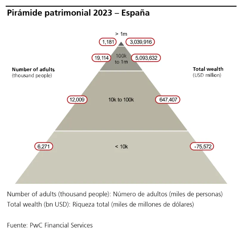 Sin embargo, a pesar de ello, España, junto a Grecia y Portugal, no ha participado en el repunte de la riqueza a escala mundial, que en 2023 aumentó un 4,2% compensado así la pérdida de riqueza de 2022. Los que sí han contribuido a esta recuperación han sido Europa, Oriente Medio y África, región que creció un 4,8%, así como en Asia-Pacífico, donde la riqueza aumentó un 4,4%.