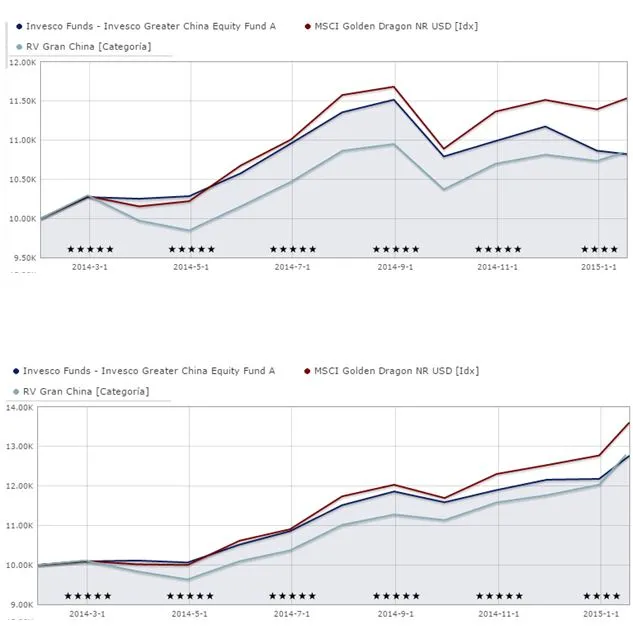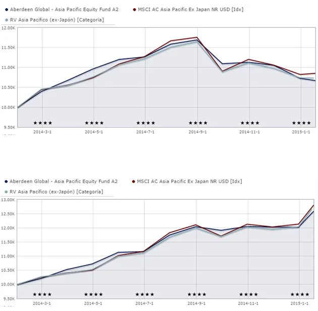 En el caso de Asia Aberdeen. En euros estamos nuevamente en máximos históricos, mientras que en dólares tenemos rentabilidad negativa incluso a 9 meses vista. La volatilidad en Euros mucho más baja.