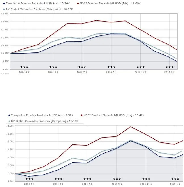 Y para que duerma tranquilo @a_martinoro :-), en el fondo de Mark Mobius de mercados Frontera. Aunque en dólares el 2014 haya sido negativo, dicho fondo capitalizado en Euros - aunque no esté en máximos - , el ejercicio 2014 ha salido bueno, y en lo que va de 2015 mientras en dólares (y a medida que desploma el Crudo y las MM.PP) sigue en picado, en Euros se ha tomado un respiro subiendo.