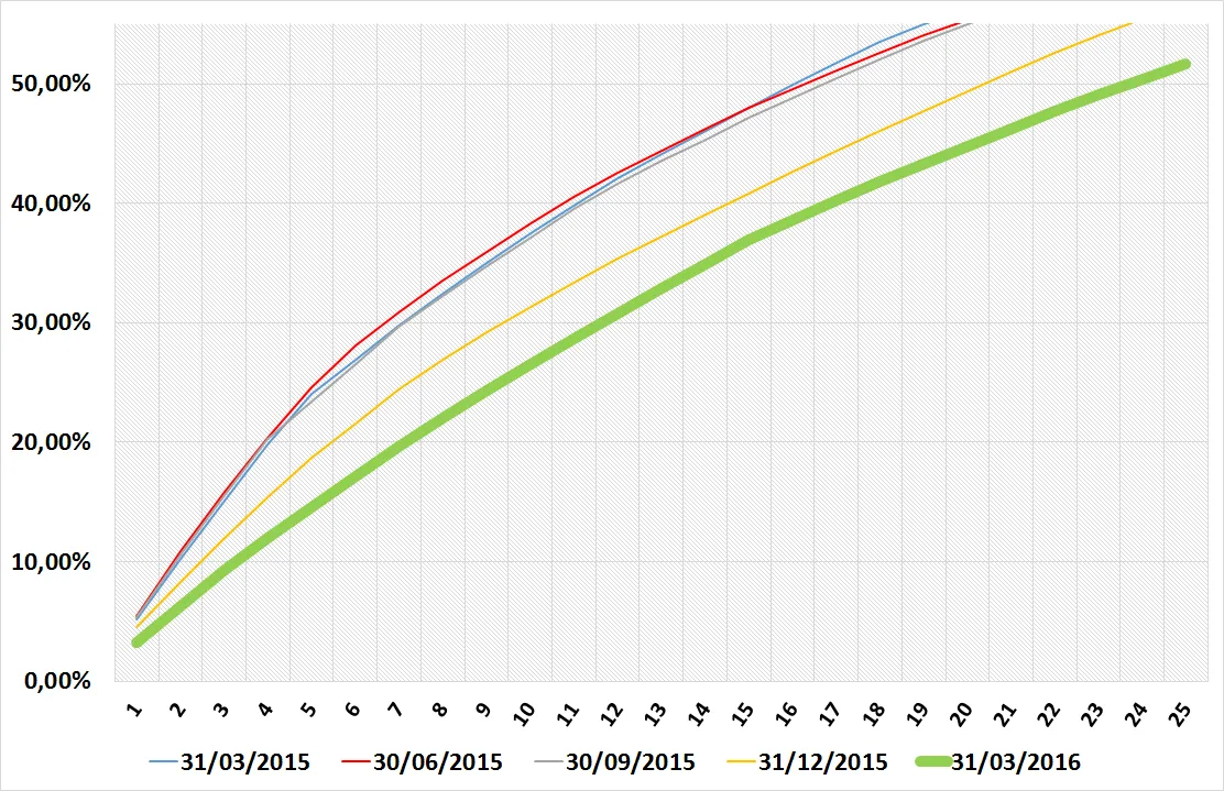 -. Reducción de la concentración en cartera. La concentración de cartera se encuentra en mínimos de los últimos trimestres. Por ejemplo, mientras en el último trimestre las veinticuatro primeras posiciones acumulaban el equivalente al 50.4% de la cartera, en el trimestre anterior las mismas posiciones llegaban hasta el 55.5%, o el 60% de hace un año. Una imagen vale más que mil palabras.