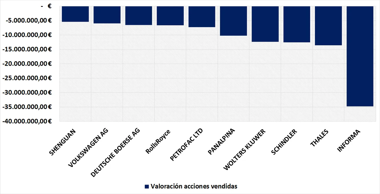 Teniendo en cuenta importes por acción y el precio medio de los dos trimestres, estas son las diez principales acciones que se han visto reducidas en cartera valoradas en euros:
