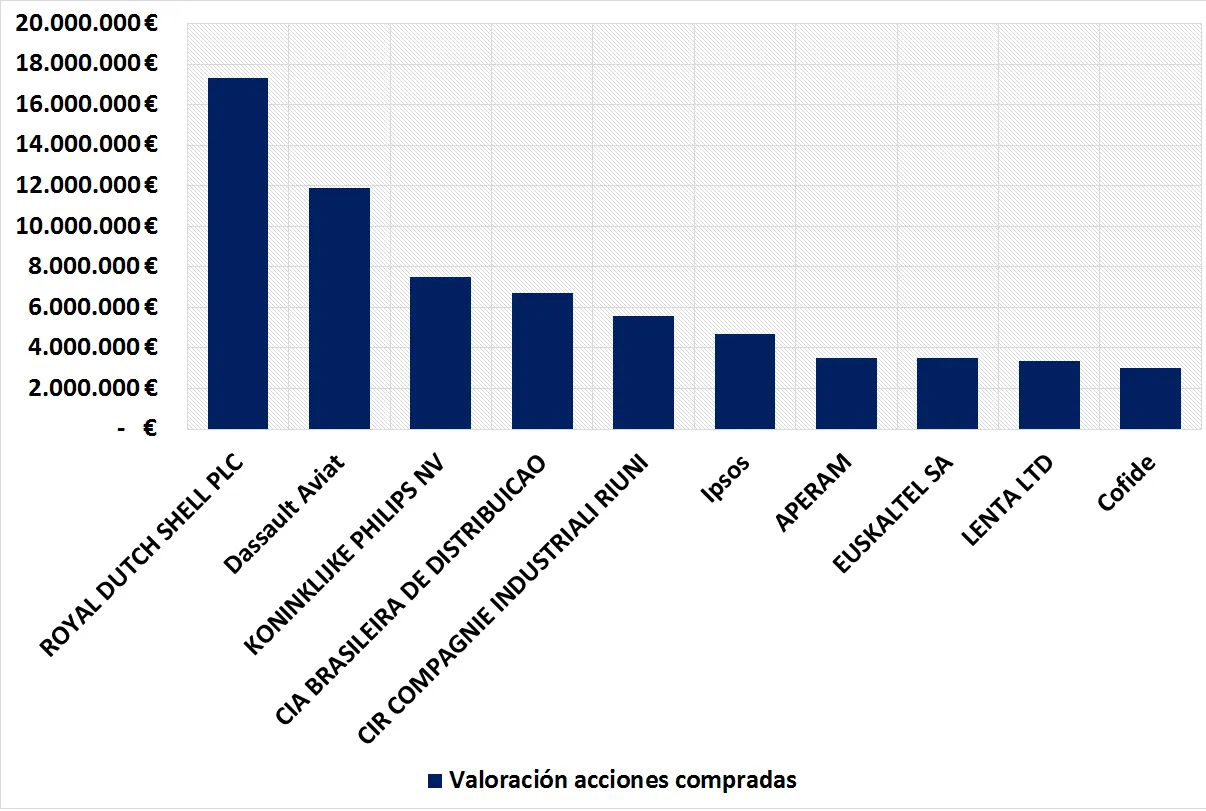 Teniendo en cuenta importes por acción y el precio medio de los dos trimestres, estas son las diez principales acciones que se han visto incremenentadas en cartera valoradas en euros: