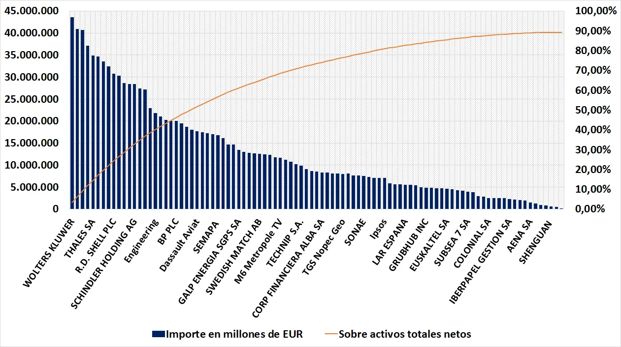 Los porcentajes tanto individuales como acumulados son sobre el total de la cartera del fondo. En ocasiones anteriores este porcentaje estaba calculado sobre únicamente sobre las posiciones de renta variable.