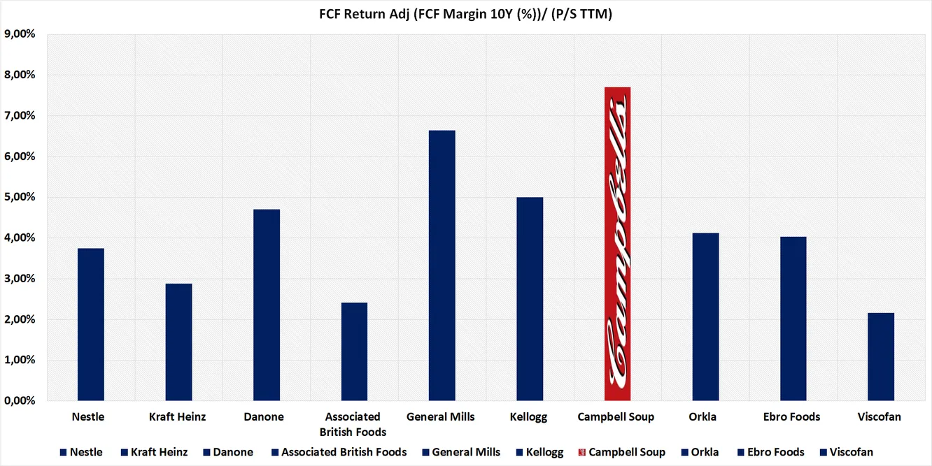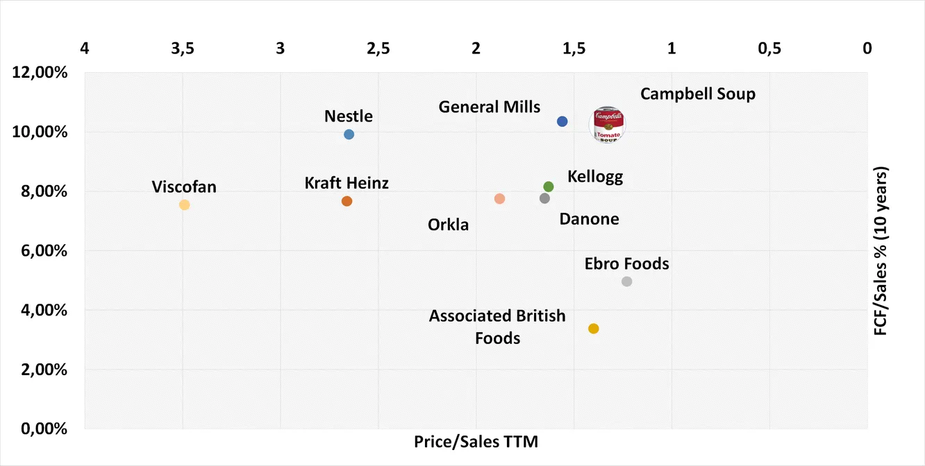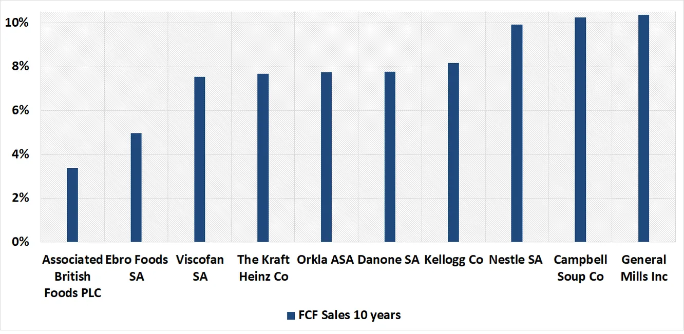 - FCF potente. El margen de FCF medio sobre ventas (10 años) excede es 10,25%. Si lo comparamos con algunos de sus peers más conocidos rankea en segunda posición únicamente superada por General Mills.
