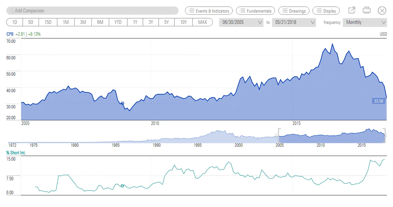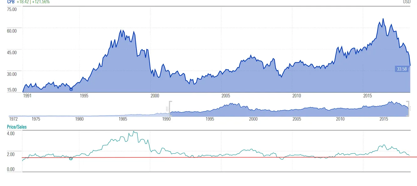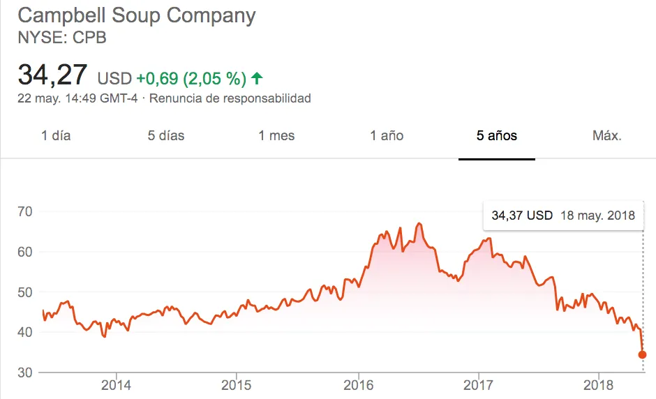 Campbell Soup Company fue fundada en New Jersey, USA, en 1869 . Está presente en más de 120 países y en los últimos diez años no ha tenido un sólo año de pérdidas. Después de un ejercicio complicado, la compañía ha llegado a perder un 40% en comparación a su valoración hace un año.