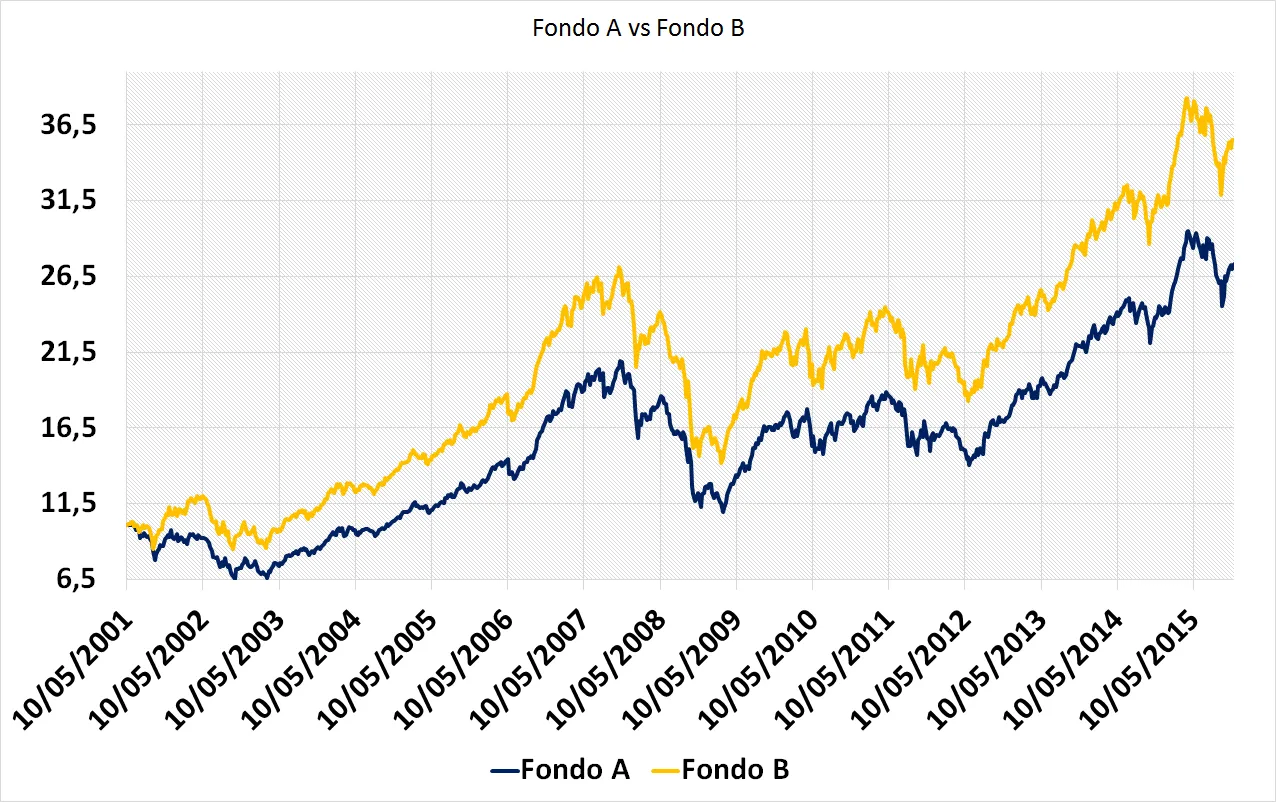 Supongamos que sólo disponemos de esta gráfica para analizar dos fondos: El fondo de inversión "A", y el fondo de inversión "B". Si tuvieramos que determinar que fondo de inversión lo ha hecho mejor a diferentes plazos... ¿que fondo de inversión elegirias?