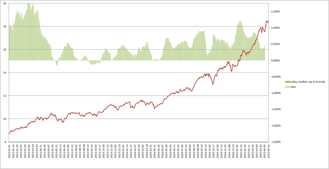 Por último, en este gráfico podéis comprar la evolución del liquidativo y los flujos, en este caso inflows, que desde octubre de 2013 son de al menos un 0,25% de los activos bajo gestión, todos los días, salvo aquellos en los que el mercado corregía. Esto es una pauta común en los movimientos puramente especulativos. Cuanto más sube, más inflows. Aviso a navegantes...
