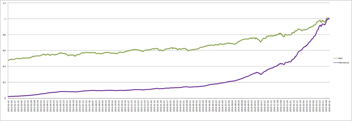 Regresión de patrimonio y valor liquidativo hasta 2013. Sólo el 4% del patrimonio de hoy, estaba en el fondo hace dos años y 3 meses.