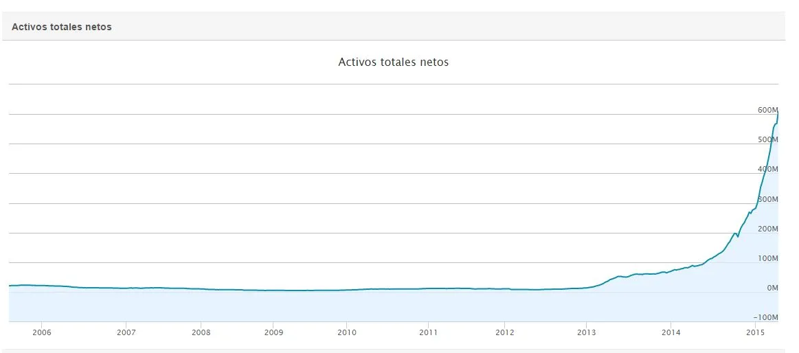 Pues bien, analizando cuales son los flujos de fondos en los fondos de inversión más populares parece razonable pensar que los inversores se han olvidado que la bolsa también cae. El gráfico de arriba son los activos totales netos bajo gestión del fondo de inversión Foncaixa Multisalud . La tendencia es exponencial.