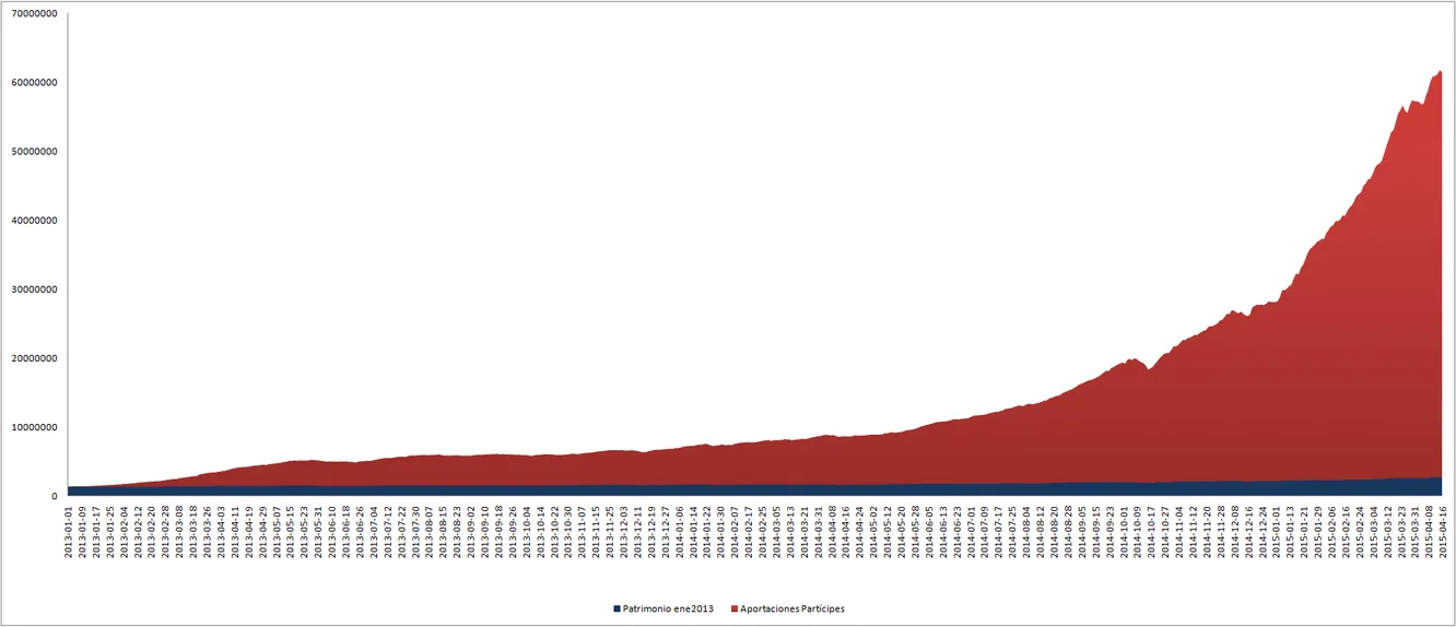 Al fin y al cabo, la informática ha traido la facilidad a los inversores en "rankear" cuales son los valores que más han subido, y en un escenario en el que las caídas ya parecen cosas del pasado subidas de un 60% interanuales parece cosas de otras épocas alejadas del "nuevo paradigma" en el que nos encontramos. A fecha de hoy el fondo acumula subidas de un 11,89 mensual compuesto desde enero de 2013 en partícipes, y 16,82 en patrimonio. Casi nada. Si la tendencia se mantiene, superaría en volumen al Banco Santander en menos de 3 años, o tener tantos partícpes como ciudadanos tiene Barcelona en menos de dos. Estoy seguro que nunca se llegaran a cumplir ninguno de los dos hitos. Pero me parece un buen indicador de cual es el sentimiento en los mercados. Os dejo dos gráficos interesantes.