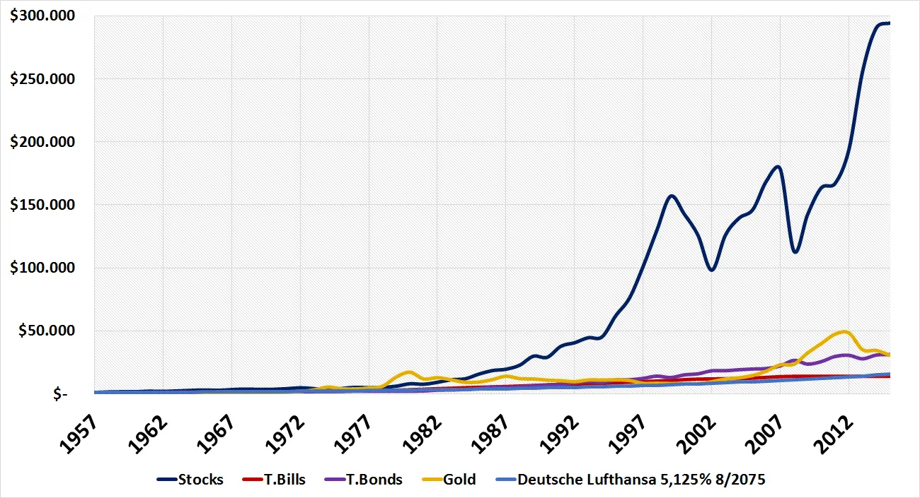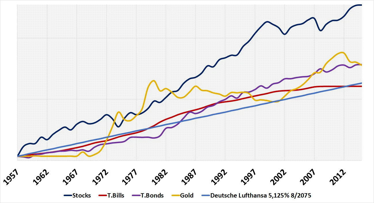 Al margen de lo exótico que pueda resultar el descubrir emisiones a tan largo plazo, son casí sesenta años lo que restan al vencimiento, me resulta sorprendente la confianza que estan mostrando algunos inversores a la hora de tomar posiciones en instrumentos en los que lo único seguro ( la obligación de devolver el prinicpal) es un evento que ocurrirá en sesenta años. Y en sesenta años pueden ocurrir muchas cosas, ya que aunque no sepamos lo que pueda traernos el futuro, siempre podemos comparar lo que nos ha venido en el pasado. Hiperinflaciones (México en los años noventa), cambios de divisa (el euro), cambios de regimienes políticos (caída del muro de Berlin), son ejemplos de lo acontencido en los últimos sesenta años, y que ningún analista hubira podido preveer. Pero hay más. Teniendo en cuenta cual es la TIR de compra, menos de un 5%, dudo que el binomio rentabilidad riesgo tenga sentido, al menos para el común de los mortales. En el gráfico siguiente podéis ver cual fue la evolución (retorno total) de diferentes activos desde 1956. Esto es, desde hace sesenta años. Además he incorporado la evolución teórica de un bono a 60 años con la TIR de compra en la que cotiza actualmente el bono de Lufthansa.