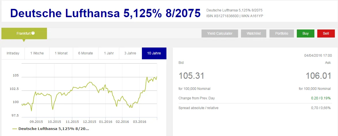Revisando las posiciones de un fondo de inversión he llegado a una emisión de bonos por la compañía alemana Lufthansa con un cupón de 5.125%. No está mal, ¿no? La sorpresa ha venido al descubrir la fecha de vencimiento, en agosto de 2075 .