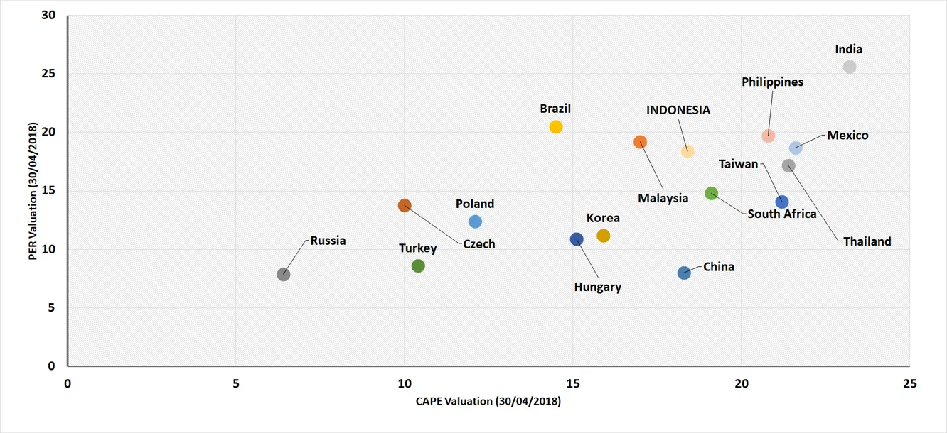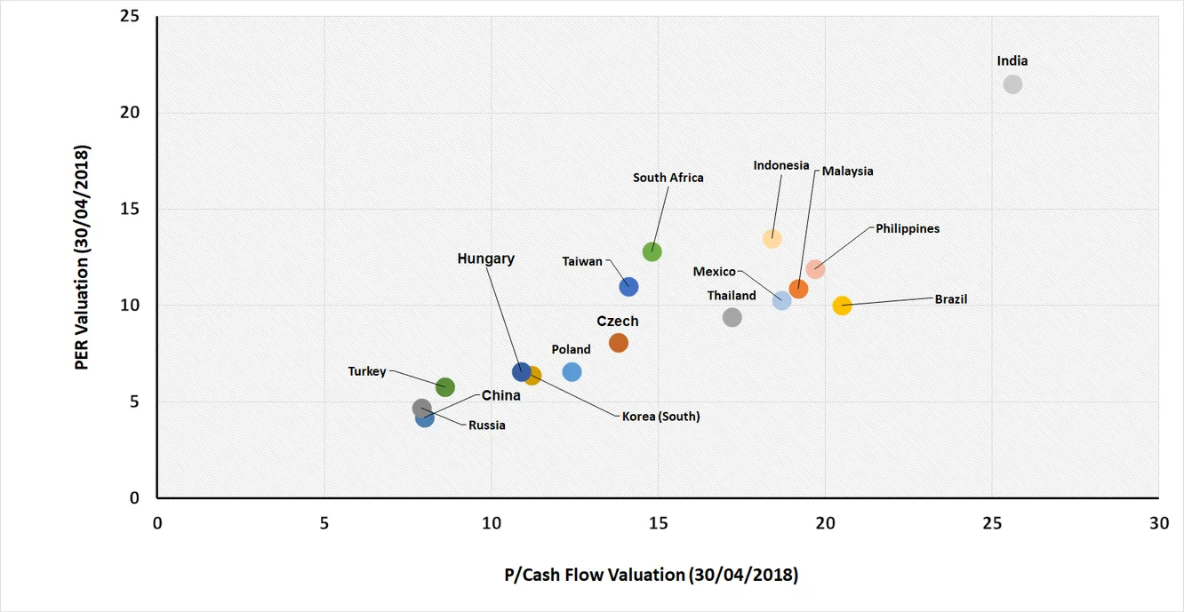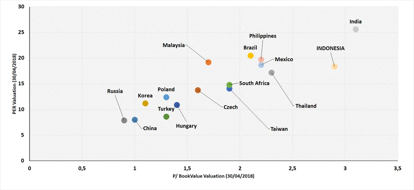 En esta segunda parte he incluido algunos otros mercados emergentes para poner en perspectiva los números. Todas las valoraciones son de índices MSCI a cierre de abril. Turquía ha bajado desde entonces tanto en términos de price to earnings como en price to book value. Es por ello que el PER en estos gráficos es ligeramente superior al del cierre de mayo.