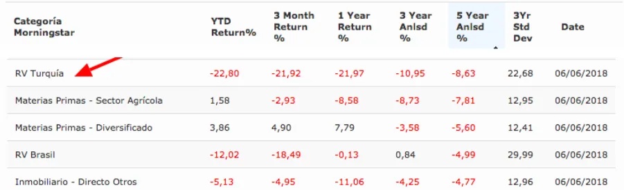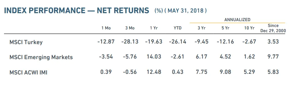 Afortunadamente el asunto que nos ocupa no trata sobre navíos de guerra sino de inversiones. La bolsa turca está siendo uno de los activos más volátiles en lo que llevamos de 2018. Y de los menos rentables. Acumulaba a cierre de mayo unas pérdidas superiores al 24%. Las tensiones políticas y especialmente el aumento de la inflación son los factores que más han influenciado para que los mercados castiguen categoría geográfica qué es la única que se encuentra en negativo en todos los plazos posibles.