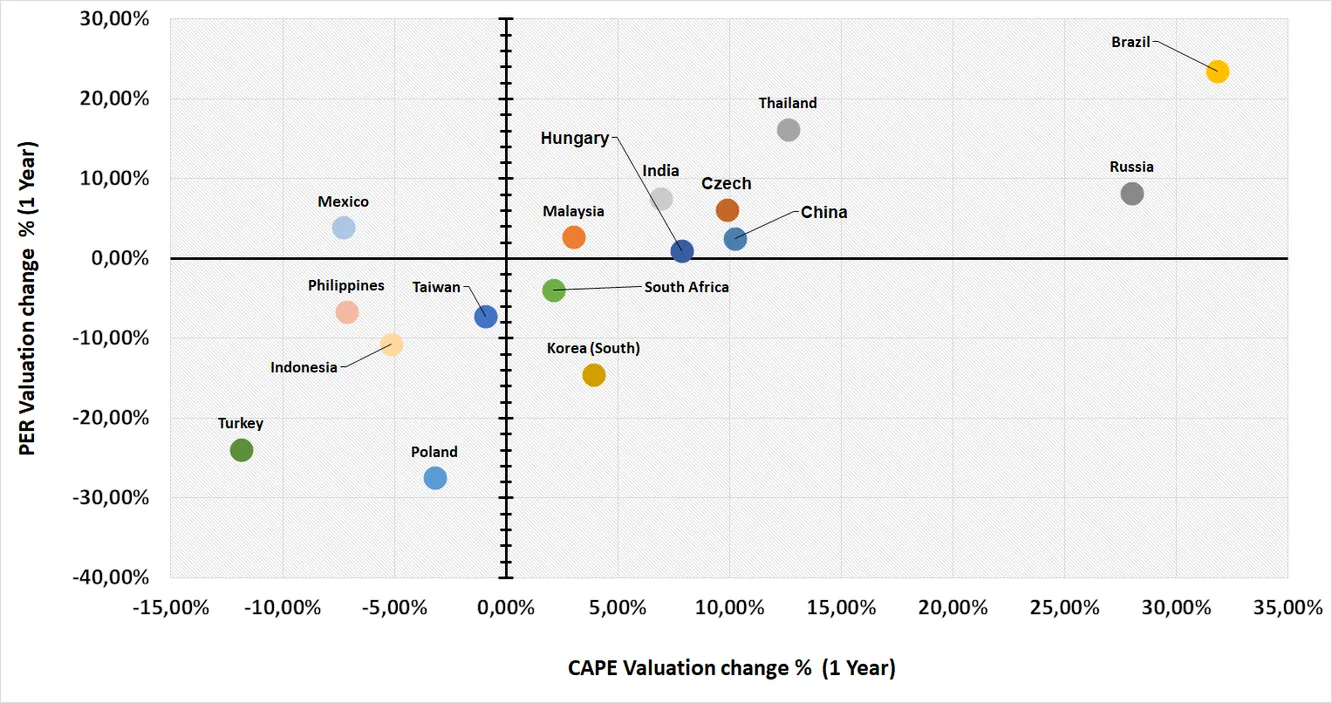 CAPE vs. Price to earnings (variación en un año)