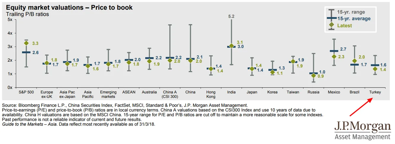Invertir en un área geográfica no es lo mismo que una inversión directa en acciones. No obstante la renta variable turca cumple (al menos) tres de ellos. En primer lugar cotiza la parte atractiva del histórico en términos de precio a beneficios y en términos de precio valor en libros. Las siguientes imágenes se corresponden a la guía de mercados de JPMorgan del 2Q de 2018. Es la edición asiática por lo que estos charts no se encuentran en Europea (dos horas buscando hasta que me di cuenta…en fin)
