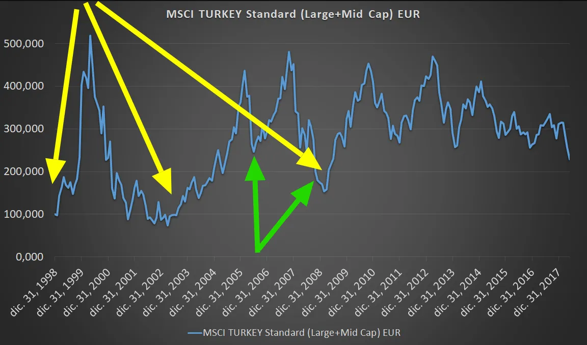 A cierre de mayo el P/E Fwd está en 6,45 y el P/BV en 1,18. No he encontrado el P/B Fwd. En el siguiente gráfico del MSCI Turkey EUR están marcadas las fechas en las que ha cotizado en múltiplos similares a los actuales.