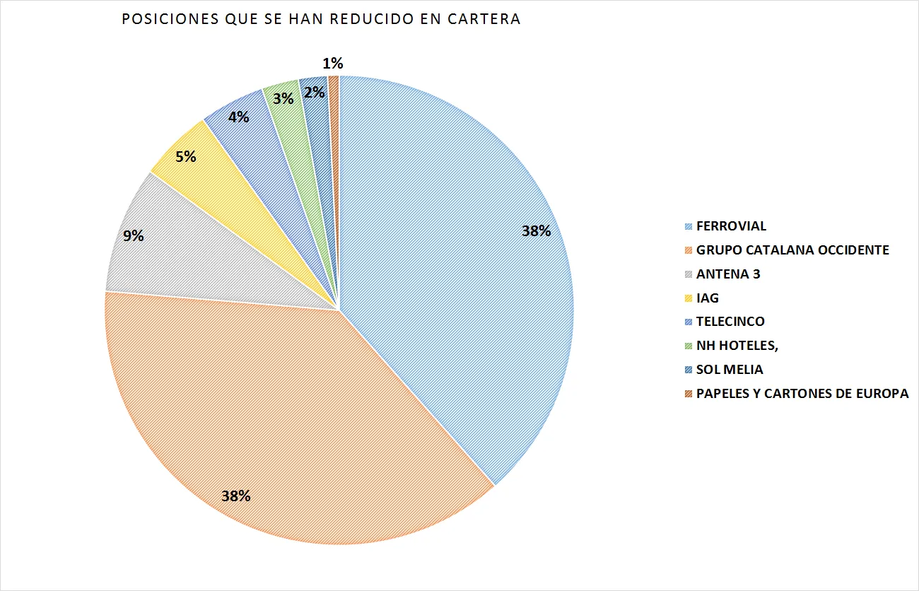Ocho compañías han visto reducidas sus acciones durante el periodo. Si valoramos las acciones vendidas durante el periodo a 30 de Junio tanto Ferrovial como Catalana Occidente acumulan cerca del 75% del montante obtenido por las posiciones liquidadas, que asciende a 6.820.000 euros (el 7.65% del total de la cartera) .