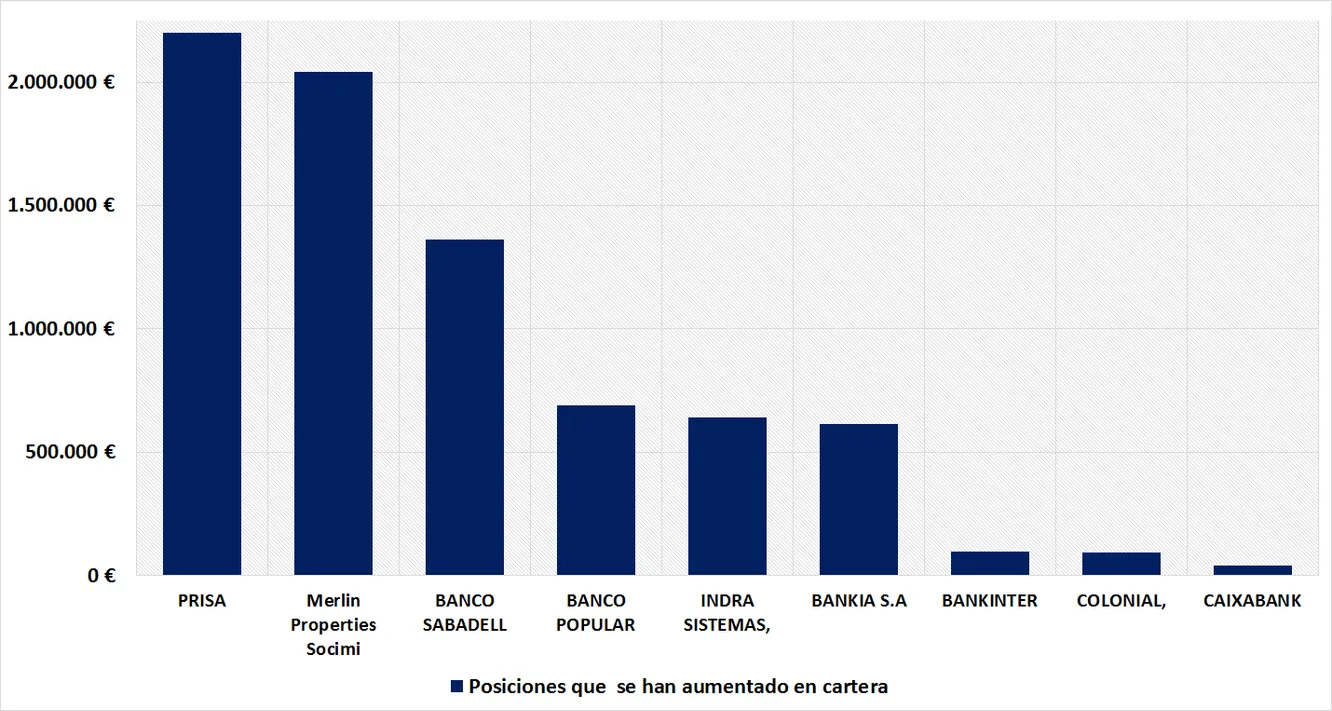 Nueve posiciones han visto incrementado el número de acciones en el periodo. Si valoramos las acciones compradas a cierre del tercer trimestre son Prisa, Merlin y Banco Sabadell las que reciben mayores inversiones. Entre las tres superan el 70% del volumen de acciones incrementadas.