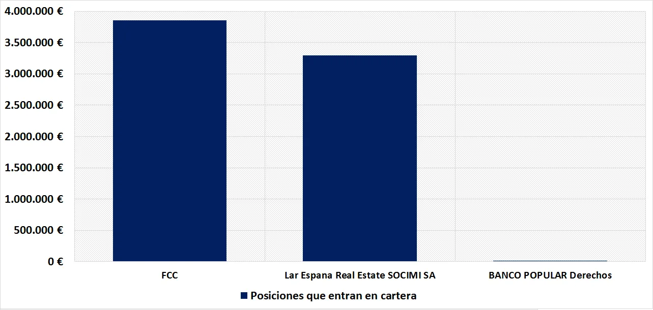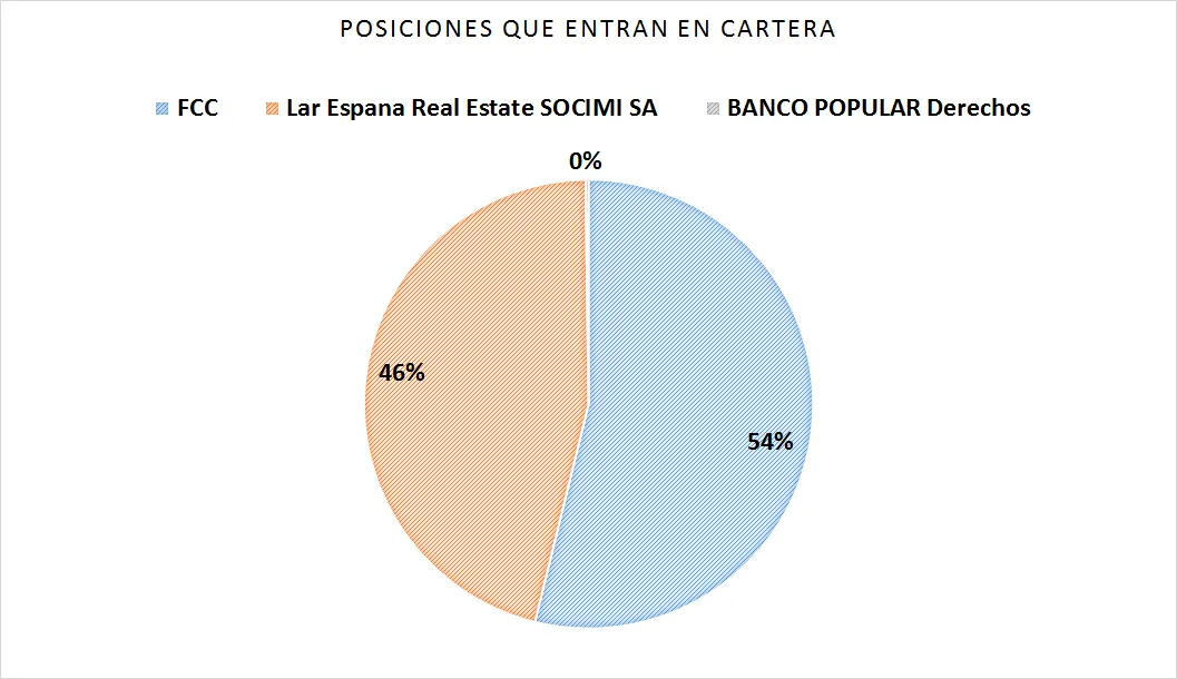Tres posiciones han sido incoporadas a la cartera, dos si tenemos en cuenta únicamente los valores que son acciones. Tanto FCC como Lar se incorporan por un importe que combinado representa más de 7.100.000 euros representantes de más del 8.5% de la cartera.