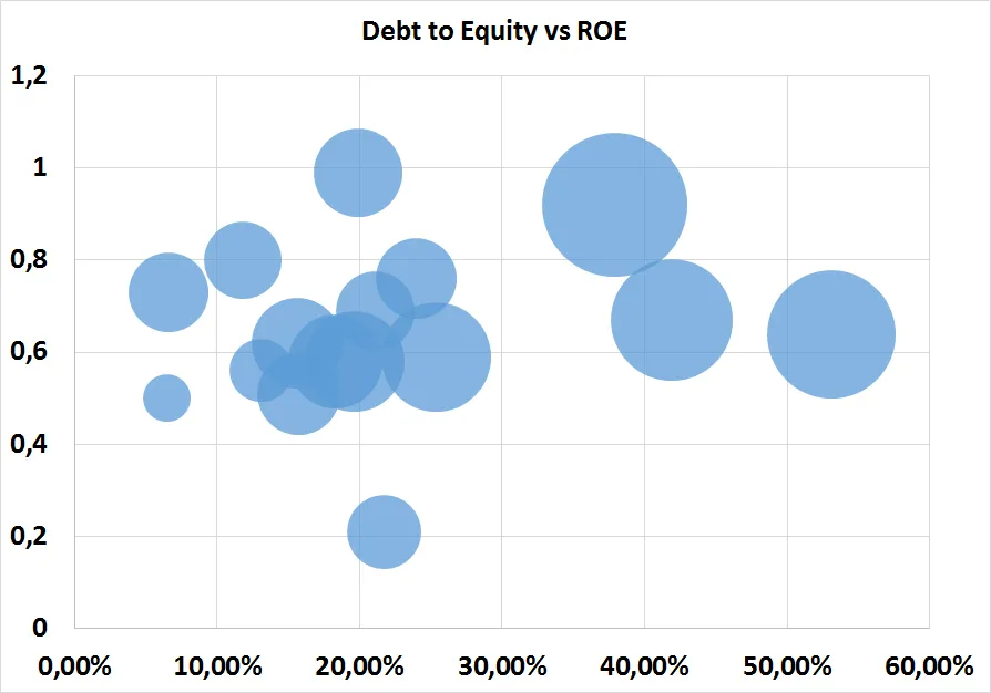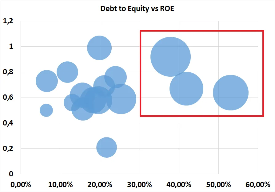 Como se puede observar a medida que nos desplazamos por el eje X hacia la derecha, las burbujas que cuentan con ROE´s tienen una burbuja mucho más grande que las que cuentan con ROEs más bajos para un mismo nivel de endeudamiento.