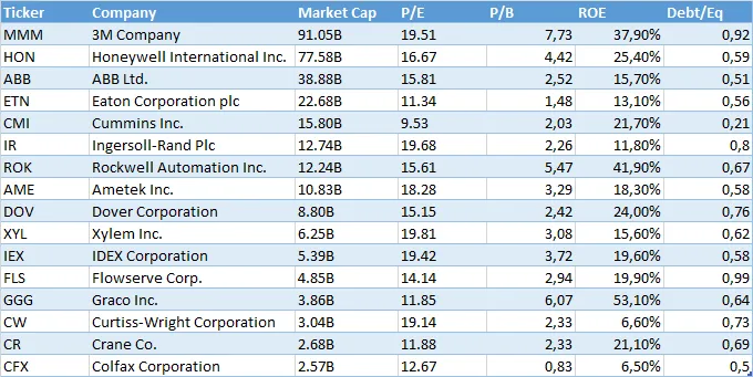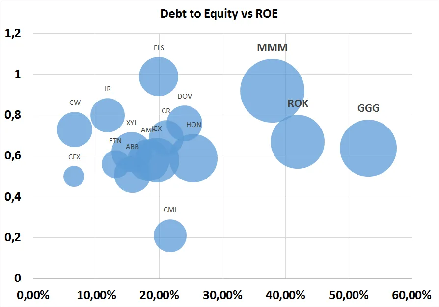 En el siguiente gráfico vemos la representación gráfica de la industria "diversified machinery". En el eje Y se representa el ratio de deuda a patrimonio neto (debt to equity), mientras que en el X se representa el ROE.