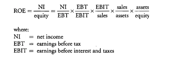Donaldson Brown allá en 1912 se hizo la misma pregunta que tú mismo podrías estar planteandote en este momento. Si el ROE de una compañía pasa de del 10% a 12%...¿por que ha sido?, porque ha aumentado los beneficios un 20% ( manteniendo el patrimonio neto constante), o por que se ha reducido el patrimonio neto en un 16%. Cualquiera de ambas circunstancias producirían el mismo efecto. Por ello se propuso descomponer la fórmula en cinco cocientes, empezando por el que divide el beneficio neto por el beneficio antes de impuestos hasta el multiplicador de patrimonio neto, dónde se encuentra la relación entre los activos totales y el patrimonio neto total. La finalidad de esta multiplicación es encontrar cuales son los drivers de la rentabilidad sobre los fondos propìos. Estos son los cinco componentes del ROE calculado según la fórmula Dupont