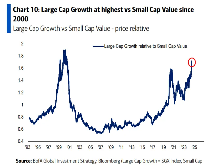 Con la relación de precios en su punto más alto en 24 años, el gráfico sugiere que podríamos estar al borde de una rotación similar. Los inversores podrían comenzar a buscar valor en las pequeñas capitalizaciones, atraídos por sus valoraciones relativamente bajas.