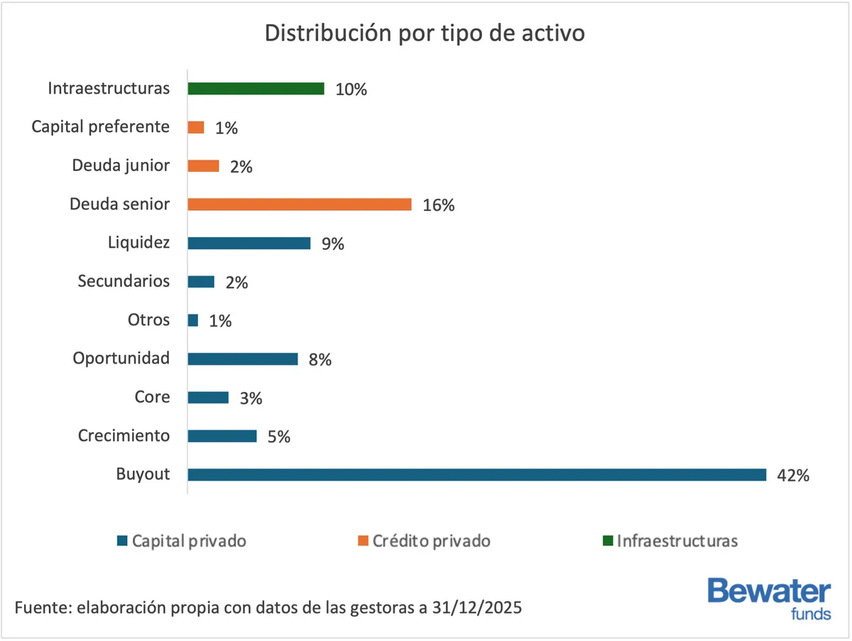 Como ya hemos comentado, la distribución por tipo de activo refleja que el grueso de la cartera se concentra en capital privado, que representa el 70% del total. Dentro de esta categoría, el segmento predominante es el de operaciones de buyout, con un 42%, seguido de deuda senior (16%), liquidez (9%), estrategias oportunistas (8%), crecimiento (5%), core (3%), secundarios (2%) y otros (1%).