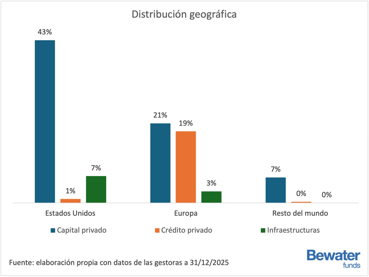Desde el punto de vista geográfico, la exposición total se distribuye con un 43% en Europa, un 43% en Estados Unidos y un 7 % en el resto del mundo. En Estados Unidos, el peso corresponde principalmente al capital privado (43%), con una contribución adicional del 7% en infraestructuras y un 1% en crédito privado.
