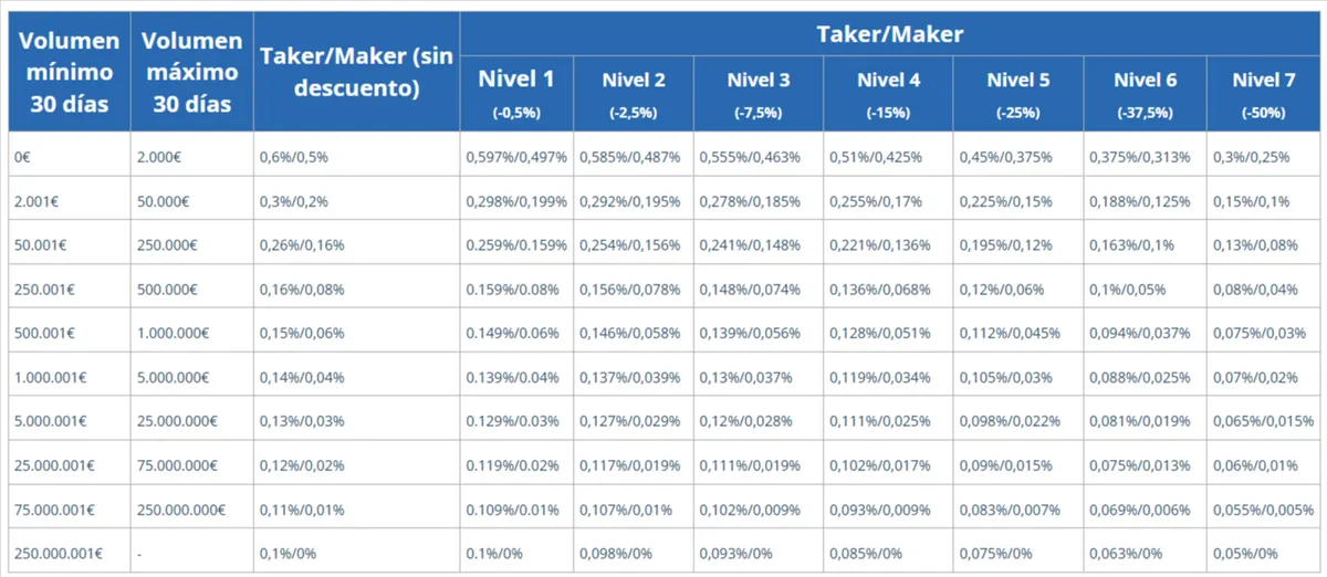 Volumen mínimo 30 días | Volumen máximo 30 días | Maker | Taker |