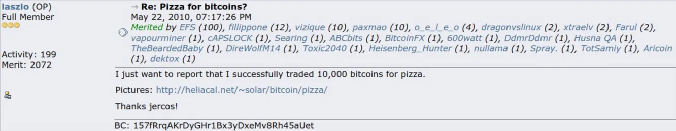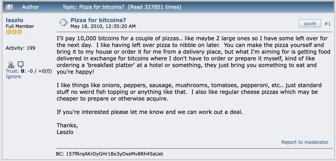 El 18 de mayo, Hanyecz publicó en un foro llamado Bitcointalk.org que estaba buscando comprar pizza, preferentemente dos grandes, y pagar con Bitcoin. Por hacer la prueba. Él ofrecía 10.000 Bitcoin a cualquiera que estuviera dispuesto a ordenar, retirar y llevarle las pizzas. Otra persona señaló que podría obtener 41 dólares por esa cantidad de Bitcoin en un determinado sitio web de intercambio, donde el precio de BTC se cotizaba a menos de medio centavo por moneda.