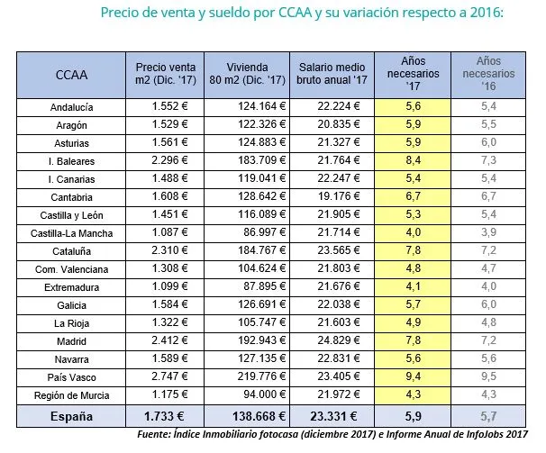 Mientras tanto, Castilla-La Mancha (1.087 euros/m2), Extremadura (1.099 euros/m2) y la Región de Murcia (1.175 euros/m2) son las comunidades donde comprar es más barato. Los manchegos tardarían "solo" cuatro años en pagarse un piso de 80m2.