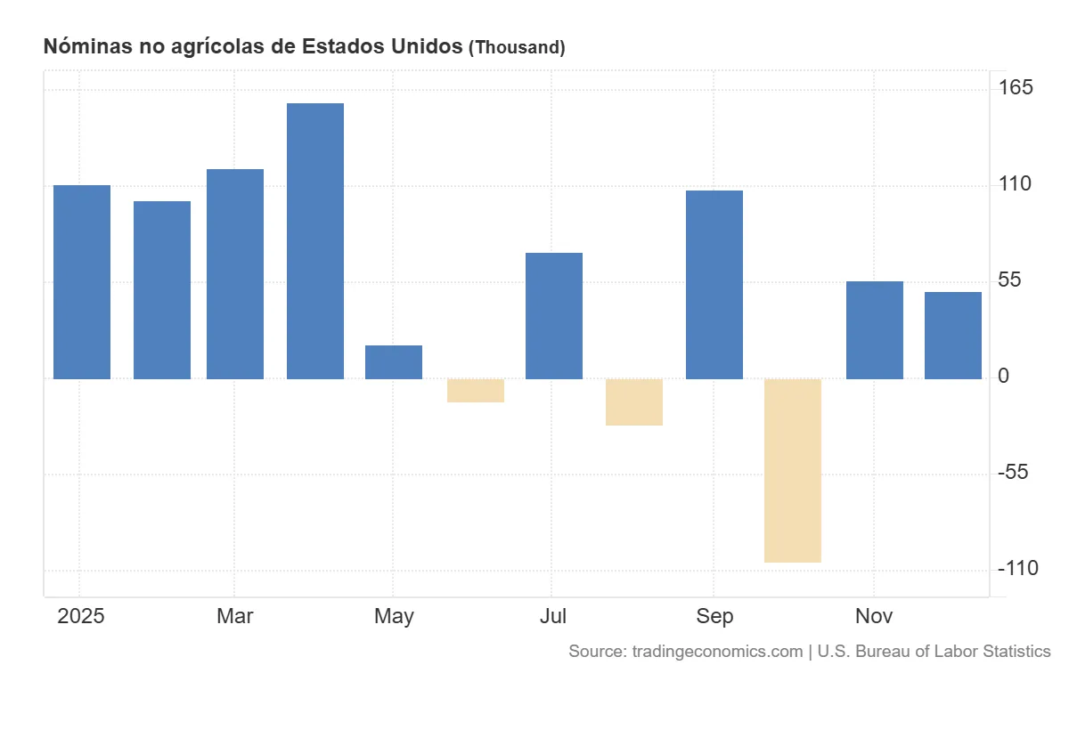 El mercado laboral estadounidense vuelve a mostrar signos de desaceleración. Las nóminas no agrícolas aumentaron en 50.000 empleos en diciembre de 2025, una cifra inferior a lo que anticipaba el consenso del mercado, que esperaba alrededor de 60.000 nuevos puestos de trabajo. El dato confirma un cierre de año con un ritmo de creación de empleo más débil de lo previsto.