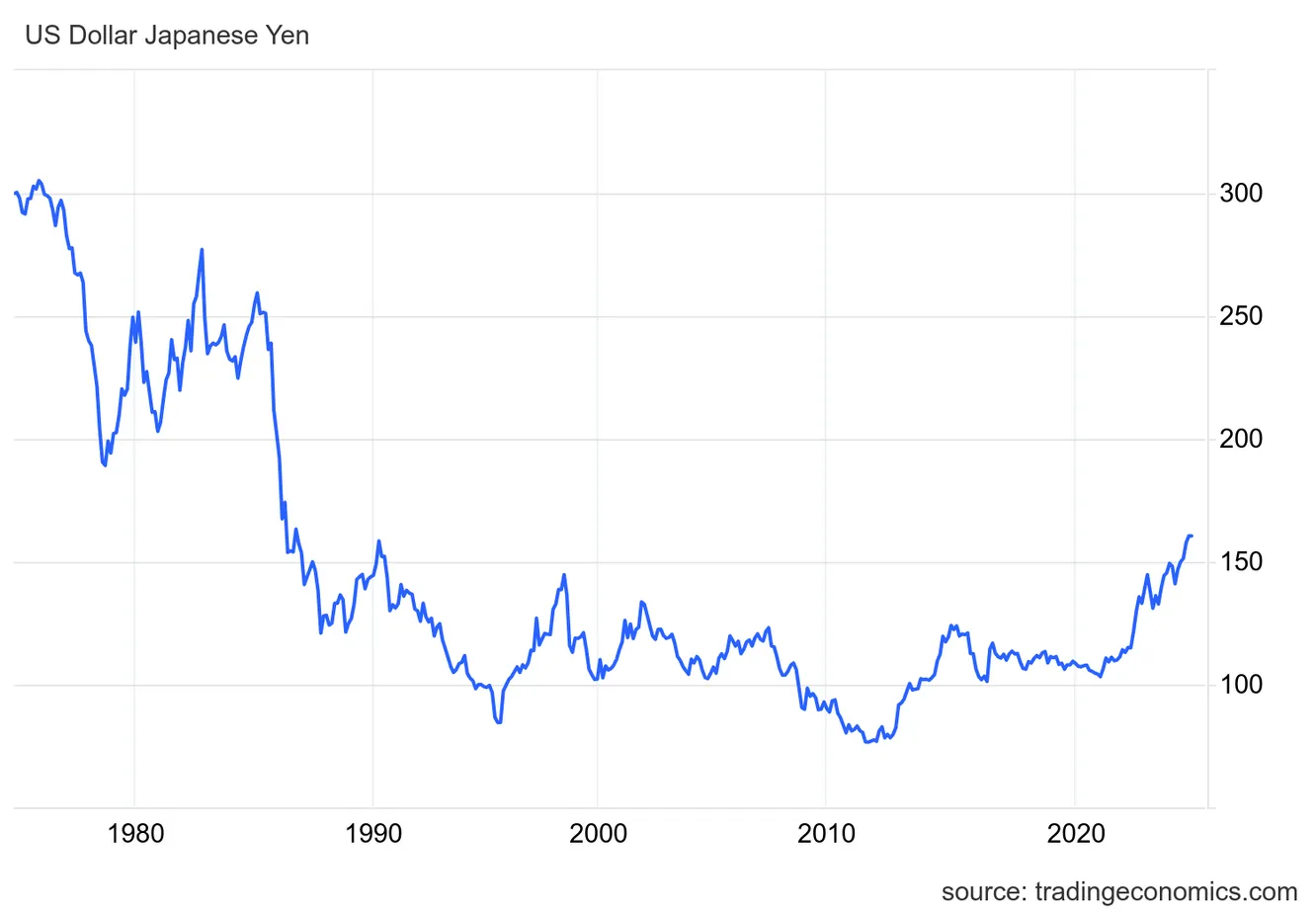 Este jueves las principales bolsas asiáticas han tenido un día complicado, tras la fuerte depreciación del yen del miércoles, que alcanzó su nivel más bajo frente al dólar desde diciembre de 1986. El tipo de cambio del dólar llegó ha llegado a estar en torno a 160,88 dólares, superando el mínimo registrado en abril pasado de 160,24 yenes, un nivel que ya generó una intervención del Gobierno japonés en el mercado de divisas para defender su moneda. La moneda alcanzó a su vez un nuevo mínimo histórico frente al euro, desde la creación de éste en 1999.