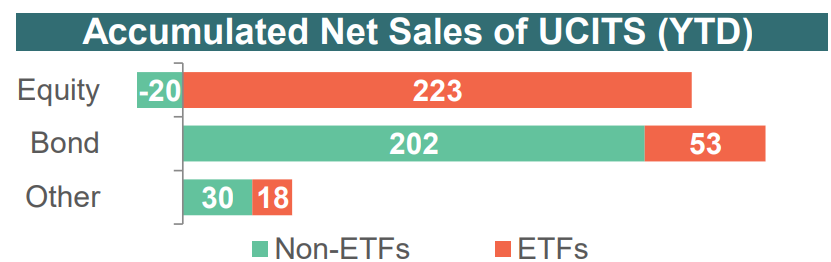 En renta fija, el comportamiento ha sido positivo tanto para los ETF como para los fondos tradicionales. Los fondos de bonos no cotizados acumulan entradas netas de 202.000 millones de euros en el año, a los que se suman 53.000 millones canalizados a través de ETF.