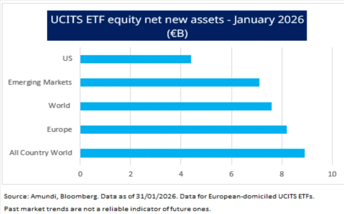 El mercado europeo de ETFs UCITS registró en enero de 2026 su mejor mes histórico, con entradas netas de 46.900 millones de euros, en un contexto marcado por la incertidumbre geopolítica y las dudas sobre las valoraciones en Estados Unidos, según el informe mensual de Amundi sobre este tipo de productos cotizados de inversión.