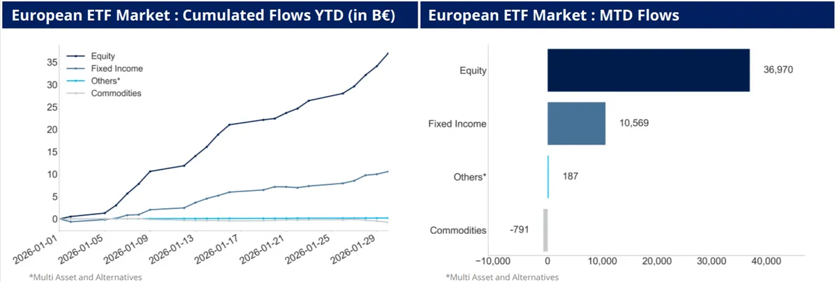 La renta variable lidera las entradas de los ETFs UCITS europeos en 2026 con 37.000 millones, mientras la renta fija suma 10.600 millones