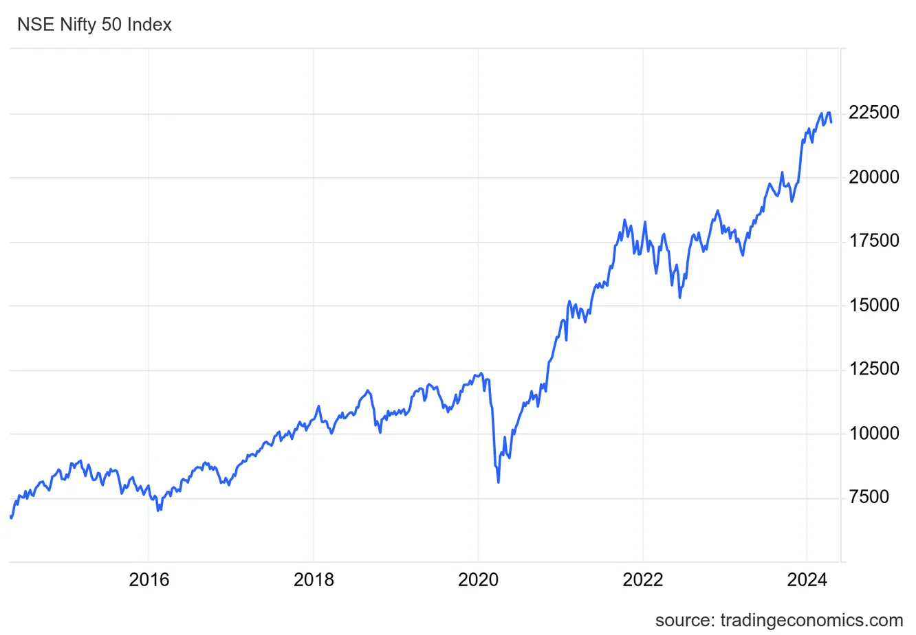 De momento, la bolsa india se encuentra cercana a sus máximos históricos. El Nifty 50, principal índice del mercado del país, cotiza por encima de los 22.000 puntos:
