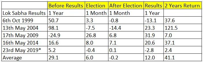 Históricamente, las elecciones en India han mostrado una tendencia a impulsar el mercado bursátil después de los resultados, especialmente cuando el resultado favorece la continuidad política. A 2 años después de las elecciones, todos los rendimientos han sido positivos: