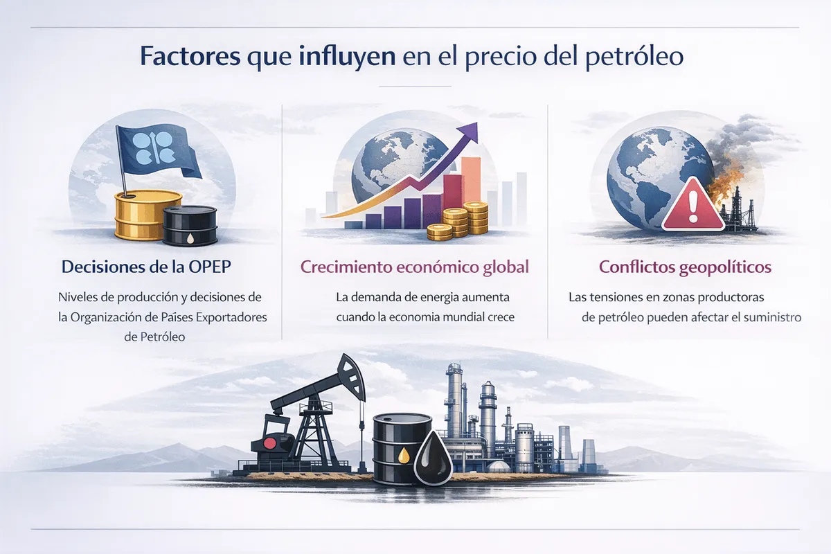 Por ejemplo, si los países productores reducen su producción mientras la demanda sigue creciendo, el precio del petróleo suele subir. En cambio, si aumenta la producción o se produce una caída de la demanda, el precio puede caer.