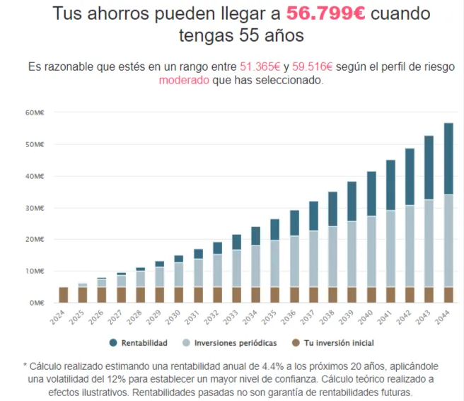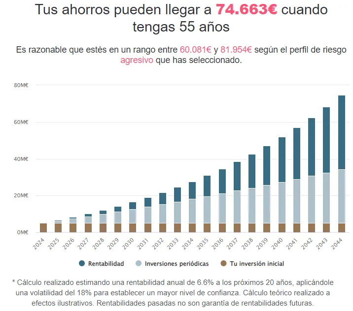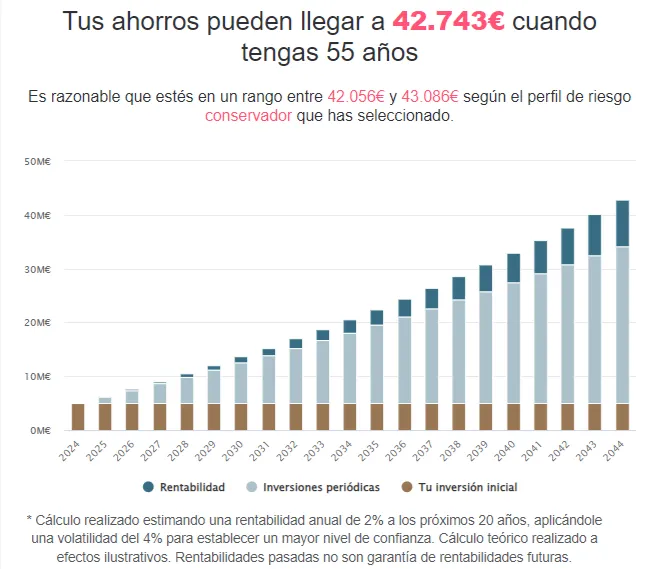 Como puedes ver, después de 20 años de disciplinado ahorro y de hacer aportaciones periódicas regulares, estarías entre 42.000 y 43.000 euros.